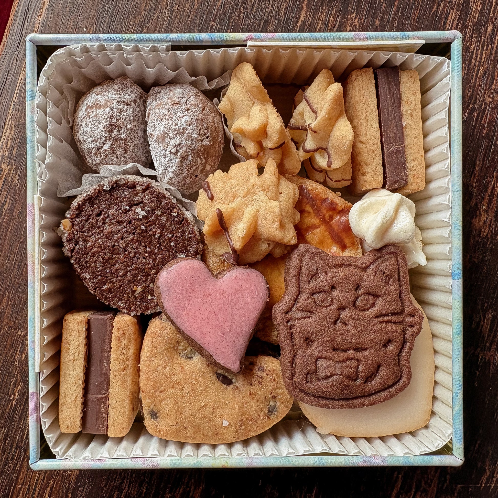 手のひらほどのかわいい10cm角サイズのクッキー缶ですが、その中には9種類の色々なクッキーが詰まっています!